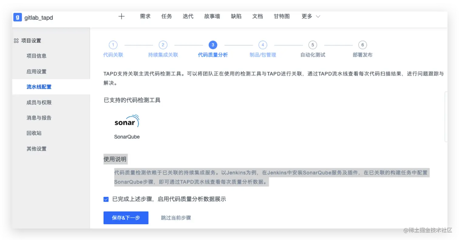代码质量检测依赖于已关联的持续集成服务。以Jenkins为例,在Jenkins中安装SonarQube服务及插件,在已关联的构建任务中配置SonarQube步骤,即可通过TAPD流水线查看每次质量分析数据。