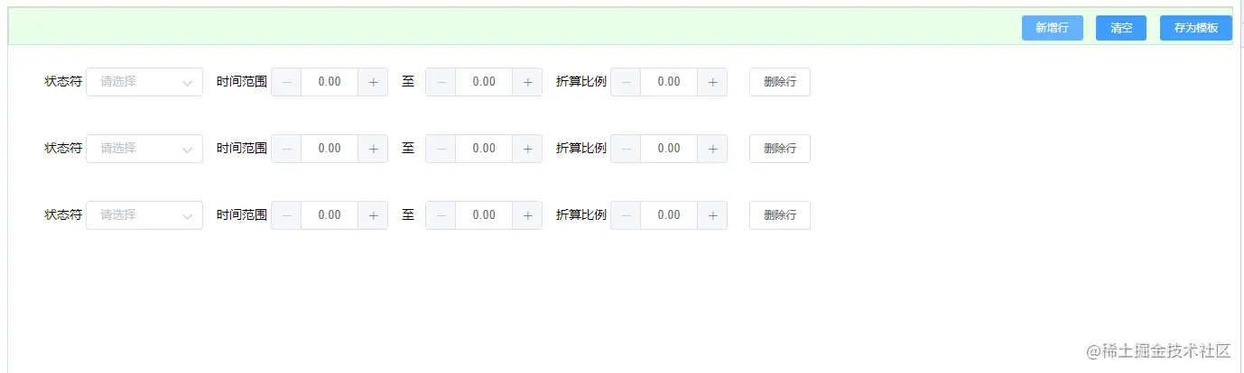 存在一排必填的内容,点击新增行后会新增一行,点击每行后面的删除按钮则会删除该行