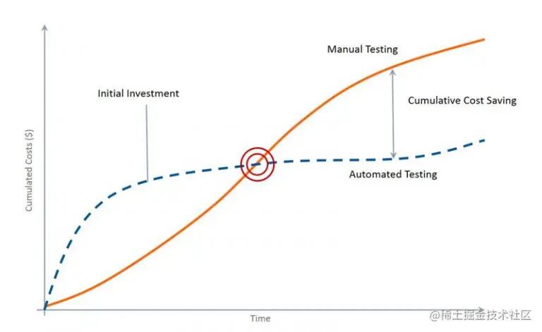 如果考虑测试的投资回报,手动测试新功能能以较低的成本快速了解应用程序的更多信息。随着知识的获取好测试的库存增加,手动测试的成本也会增加。另一方面,自动化具有更高的初始成本,随着它的进展而降低。这种趋势如下图所示: