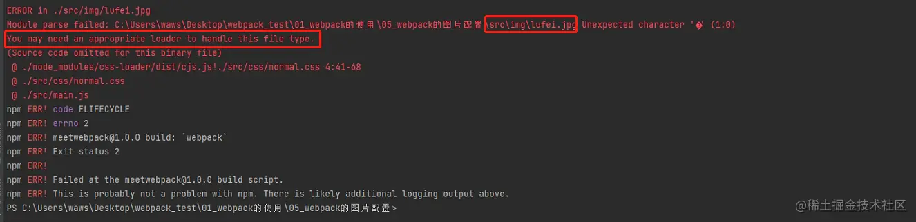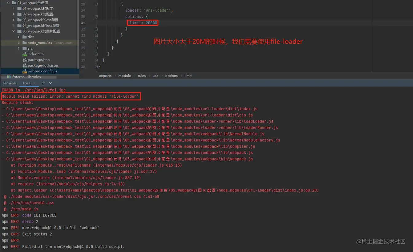 这次因为大于20kb的图片,会通过file-loader进行处理,但是我们的项目中并没有file-loader