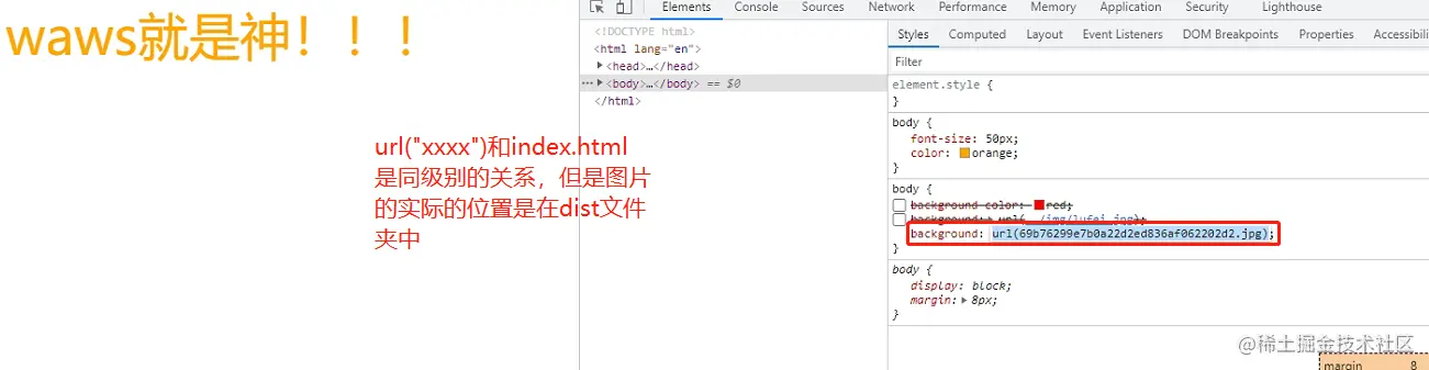 - 使用file-loader加载背景图片并没有起作用的一个重要原因是:我们将图片复制到指定文件夹dist中,并且使用hash重新生成一个名字,防止重复