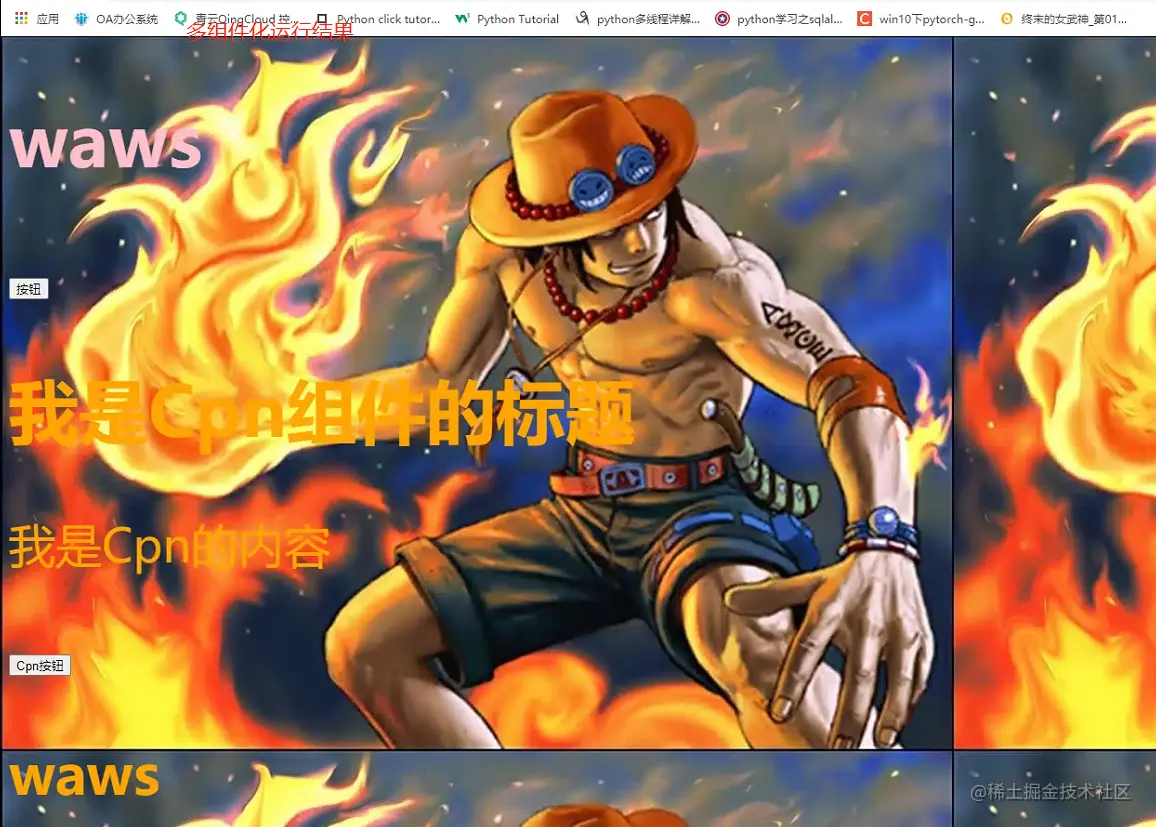 # template、style、script的代码完成分离 # 在App中引入Cpn的组件,注意导入实在script中完成的 <template> <div> <h2 class="title">{{message}}</h2> <button @click="buttonClick">按钮</button> <Cpn></Cpn> </div> </template> <script> import Cpn from "./Cpn.vue" export default { name: "App", components:{ Cpn }, data(){ return { message:"waws" } }, methods:{ buttonClick(){ alert("点击了按钮") } } } </script> <style scoped> .title { color:pink; } </style> -