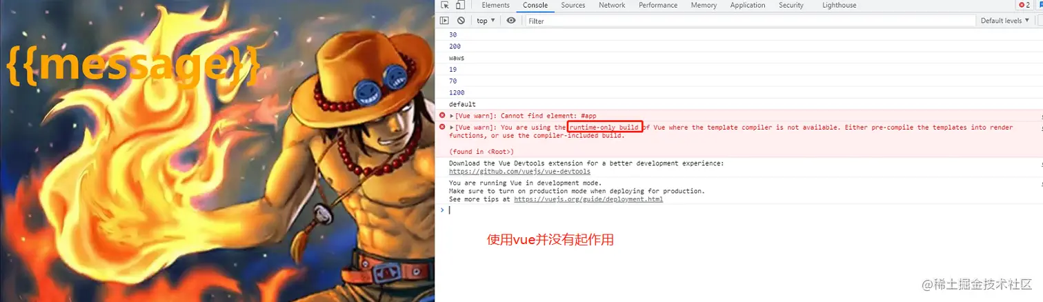 这里我只说解决方案:Vue不同版本构建,后续我具体讲解runtime-only和runtime-compiler的区别。