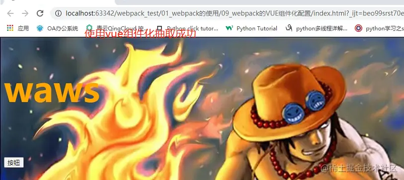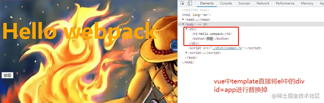 # 在index.html中将模板内容抽取出来 <div id="app"></div># 使用template进行代码开发 //使用vue进行开发 import Vue from "vue" new Vue({ el:"#app", template:` <div> <h2>{{message}}</h2> <button @click="buttonClick">按钮</button> </div> `, data:{ message:"Hello webpack" }, methods:{ buttonClick(){ alert("点击了按钮") } } })-