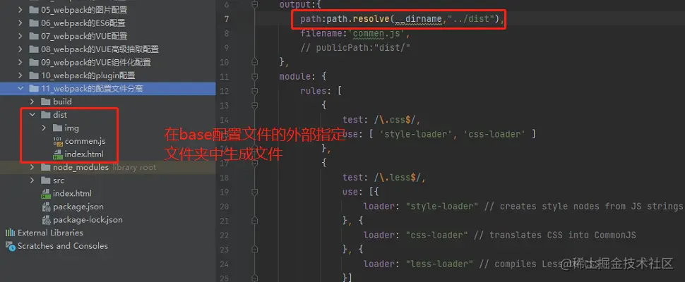 我们的配置文件分为开发时的配置文件和生产环境的配置文件,我们都将所有配置文件都放到webpack.config.js中的时候,我们切换环境还要更改我们的配置文件,比较麻烦,所以我们要将两个部分配置进行抽离,形成三个文件,分别是
