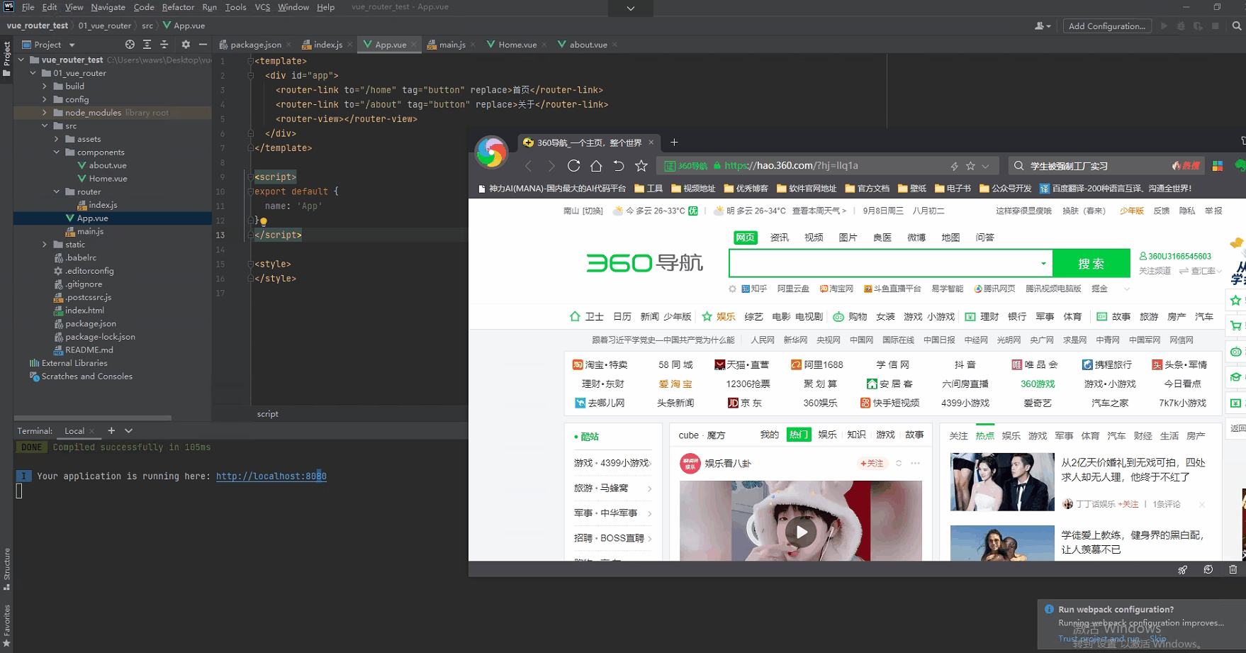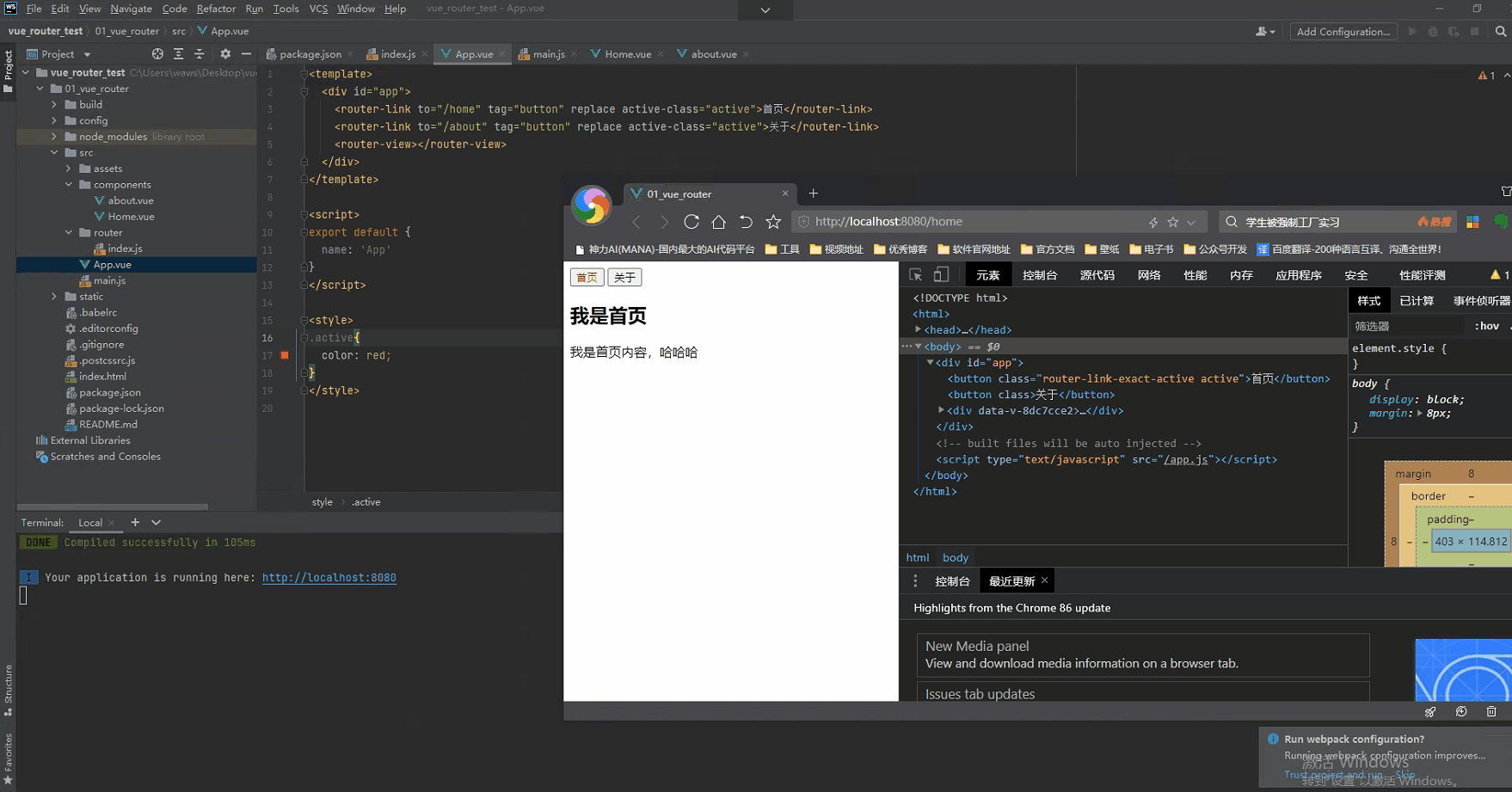 <router-link>对应的路由匹配成功时, 会自动给当前元素设置一个router-link-active的class, 设置active-class可以修改默认的名称.- 在进行高亮显示的导航菜单或者底部tabbar时, 会使用到该类.
