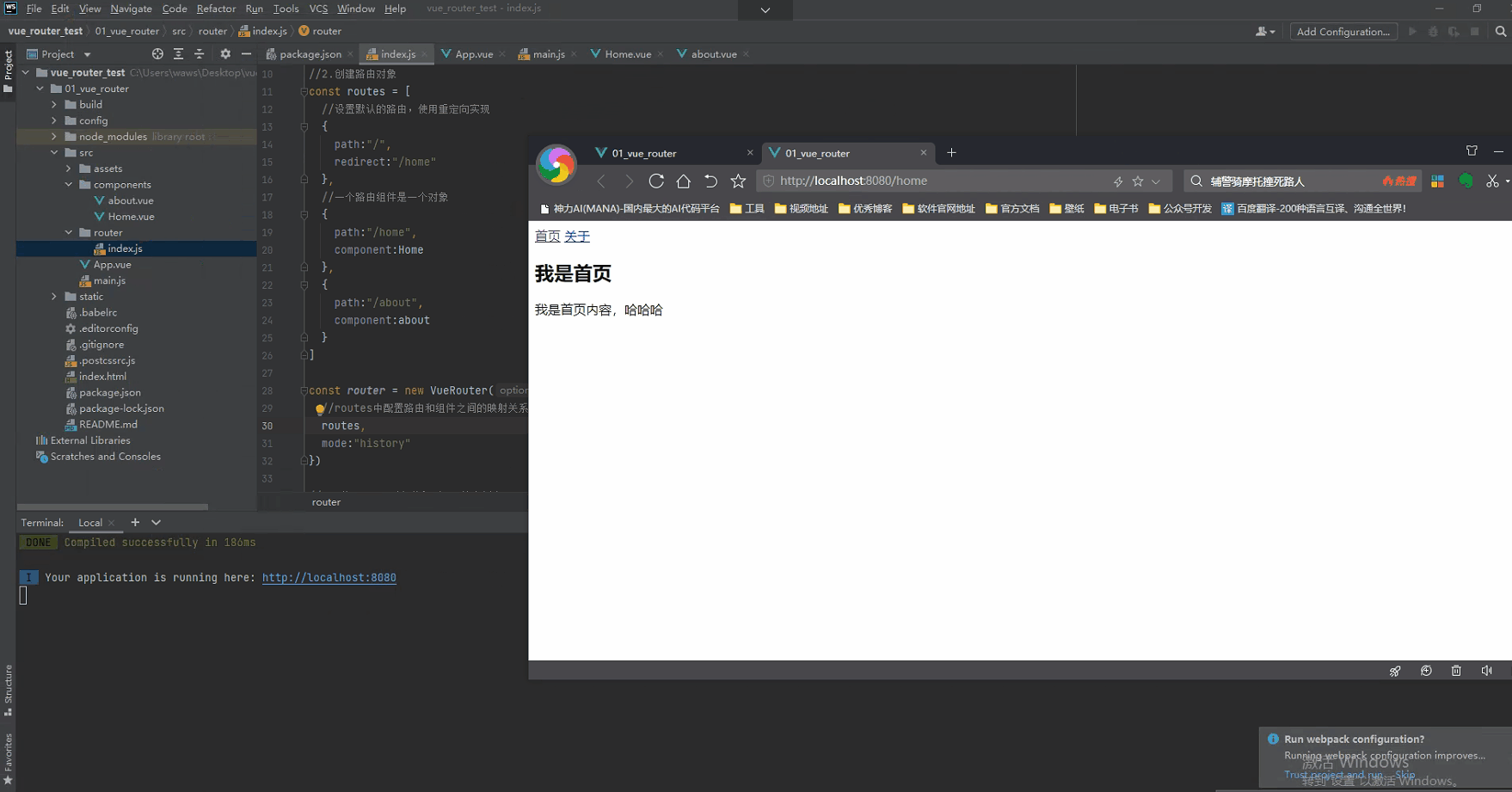 <router-view>渲染首页组件呢?- 非常简单, 我们只需要配置多配置一个映射就可以了