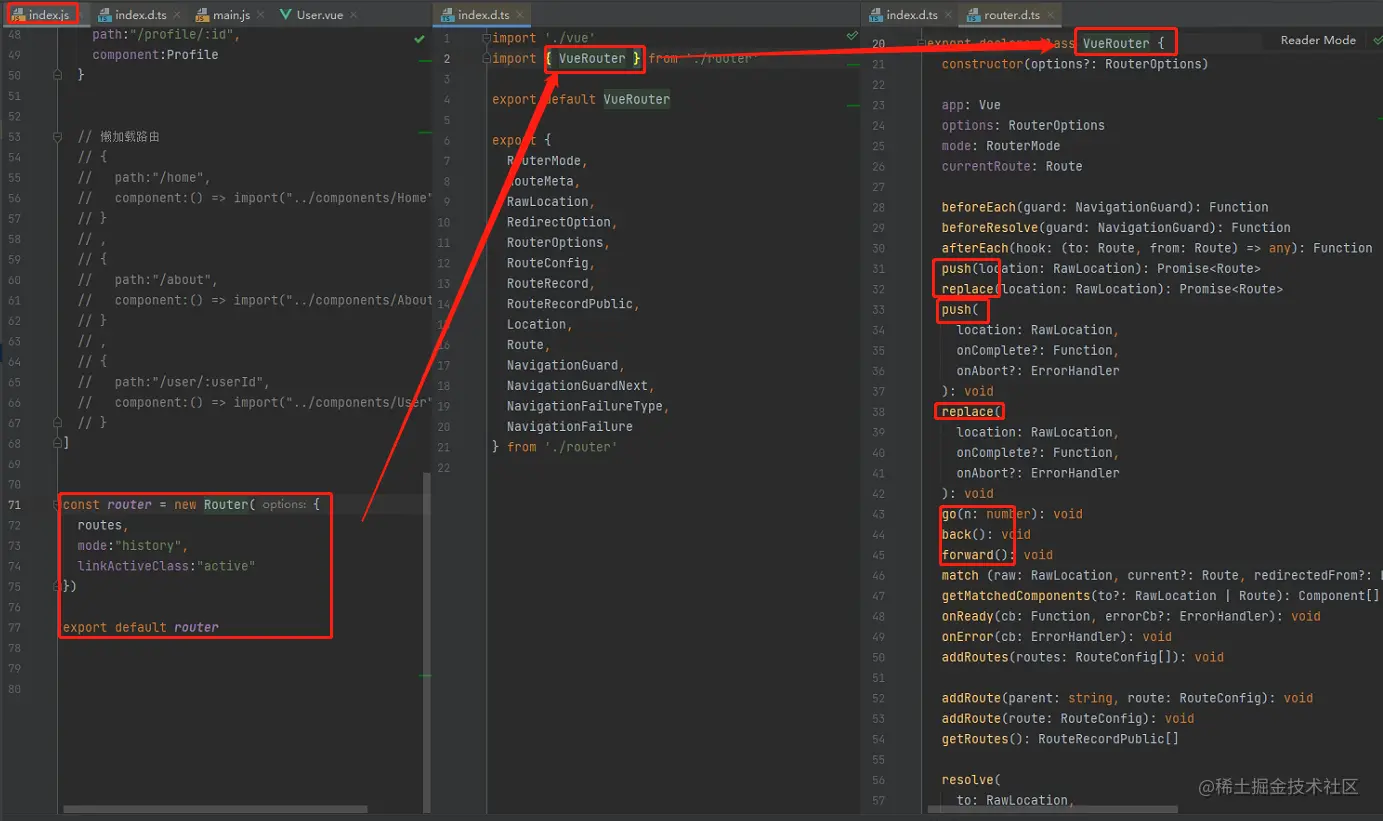# 使用push的方式进行切换路由 <template> <div id="app"> <button @click="HomeBtnClick">首页</button> <button @click="AboutBtnClick">关于</button> <router-view></router-view> </div> </template> <script> export default { name: 'App', methods:{ HomeBtnClick(){ this.$router.push("/home") }, AboutBtnClick(){ this.$router.push("/about") } } } </script> <style> .active{ color: red; } </style># 使用replace的方式进行切换路由 <template> <div id="app"> <button @click="HomeBtnClick">首页</button> <button @click="AboutBtnClick">关于</button> <router-view></router-view> </div> </template> <script> export default { name: 'App', methods:{ HomeBtnClick(){ this.$router.replace("/home") }, AboutBtnClick(){ this.$router.replace("/about") } } } </script> <style> .active{ color: red; } </style>