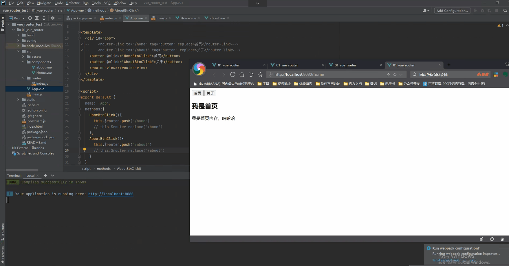<template> <div id="app"> <router-link to="/home" tag="button" replace>首页</router-link> <router-link to="/about" tag="button" replace>关于</router-link> <router-view></router-view> </div> </template> -