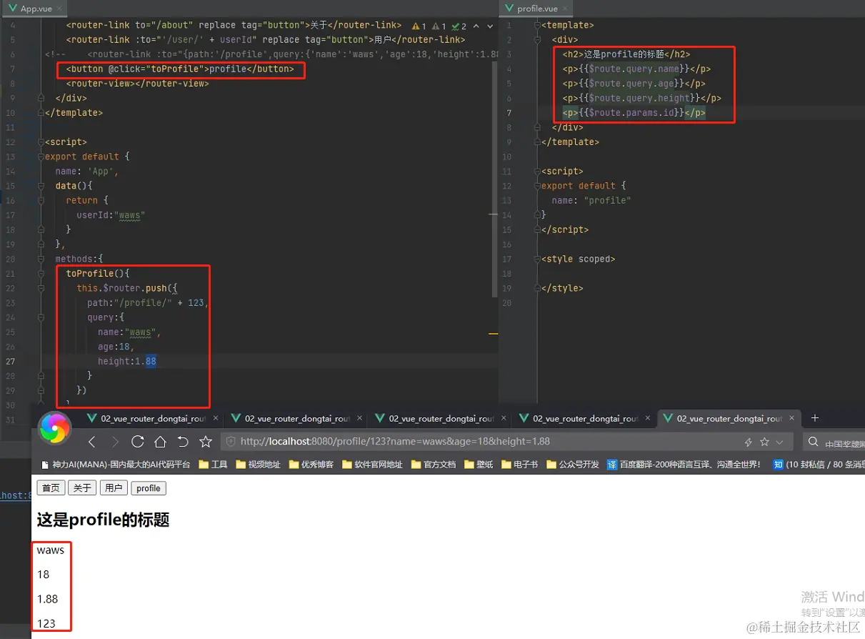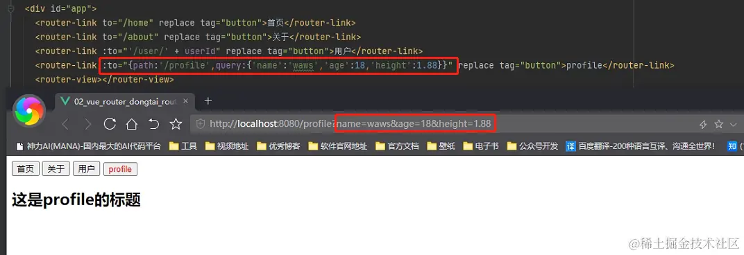 <template> <div id="app"> <router-link to="/home" replace tag="button">首页</router-link> <router-link to="/about" replace tag="button">关于</router-link> <router-link :to="'/user/' + userId" replace tag="button">用户</router-link> <router-link :to="{path:'/profile',query:{'name':'waws','age':18,'height':1.88}}" replace tag="button">profile</router-link> <router-view></router-view> </div> </template> <script> export default { name: 'App', data(){ return { userId:"waws" } } } </script> <style> .active{ color: red; } </style>-