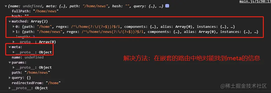 - 我们使用的是嵌套路由,这样我们/home/news 而我们将meta属性放在了/home上,所以匹配不上,meta中没有数据,出现错误