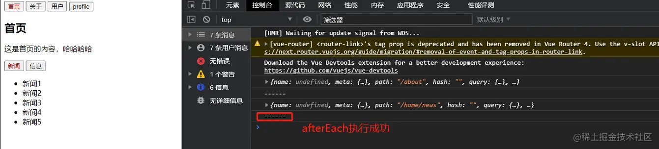 router.beforeEach(function (to,from,next){ //从from到to的路由跳转 document.title = to.matched[0].meta.title console.log(to); next() }) router.afterEach((to,from)=>{ console.log("------"); }) -