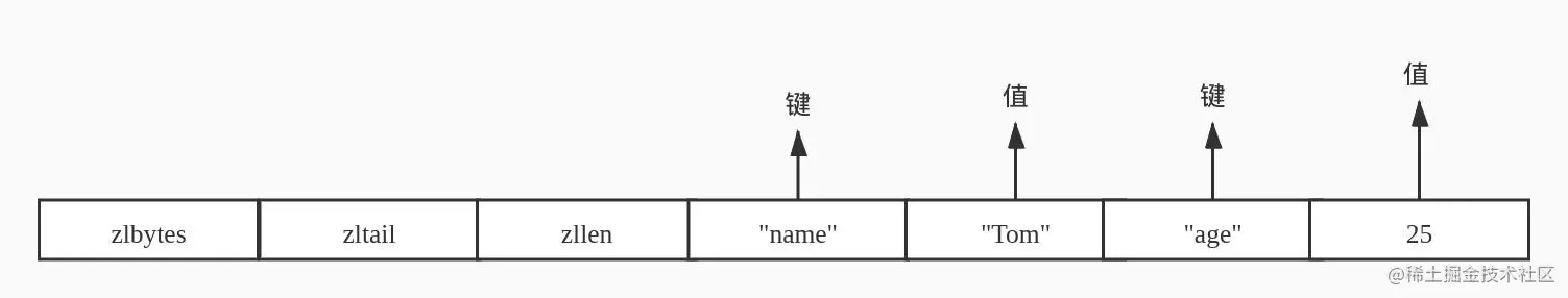 ziplist 编码的哈希对象使用压缩列表作为底层实现,每当有新的键值对要加入到哈希对象时,程序会将保存了键的压缩列表节点推入到压缩列表表尾,然后在将保存了值的压缩列表节点推入到压缩列表表尾。
