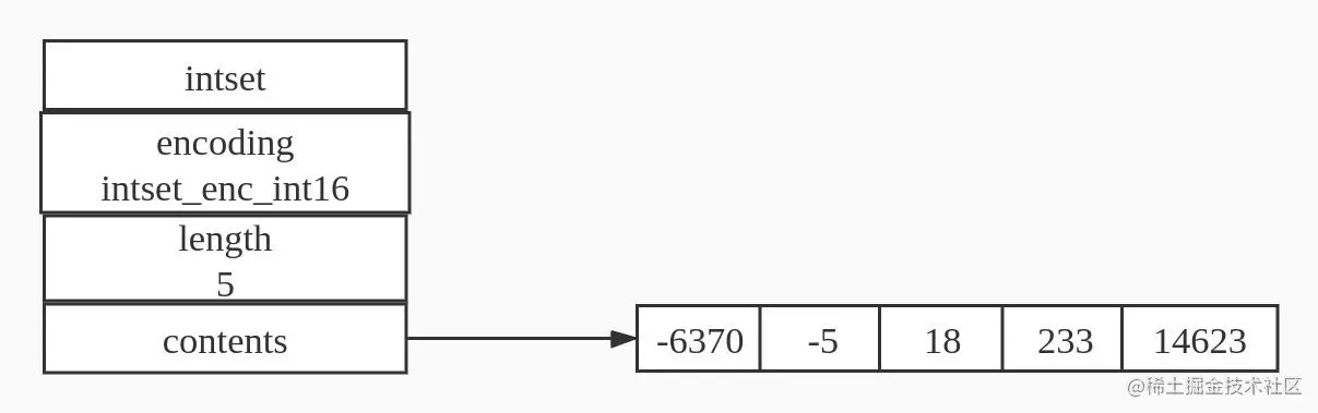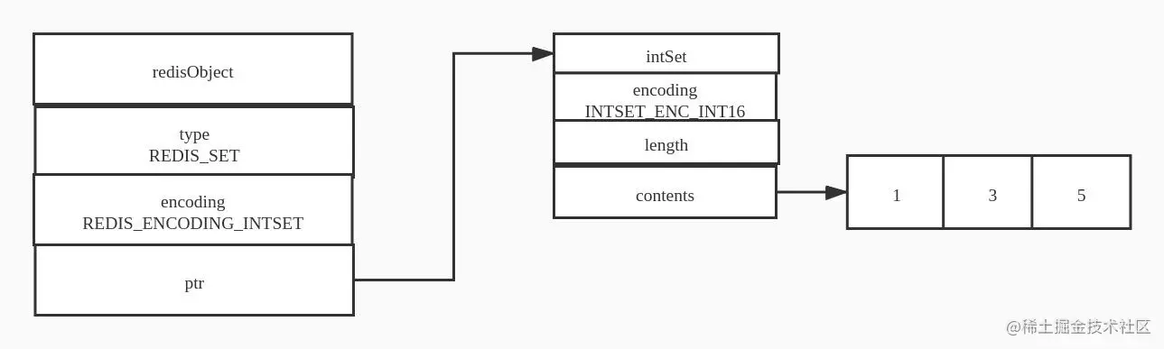 int set 编码的集合对象使用整数集合作为底层实现,集合对象包含所有的元素都被保存在整数集合里面。