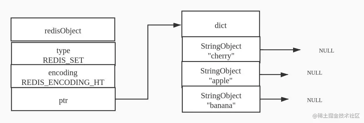 另一方面,hashtable的属性集合对象使用字典作为底层实现,字典的每个键都是一个字符串对象,每个字符串对象包含了一个集合元素,而字典的值则全部被设为null