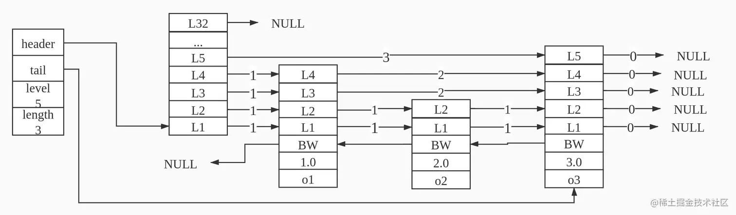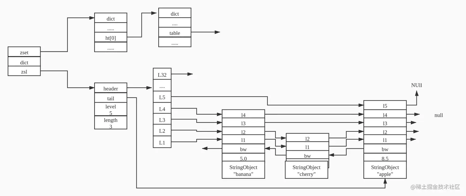 skiplist编码的有序集合对象使用zset结构作为底层实现,一个zset结构同时包含一个字典表和跳跃表。zset结构中的zsl跳跃表按分值大小保存了所有的集合元素,除此之外zset结构中的dict字典为有序集合创建了一个从成员到分值的映射,字典中的每个键值对都保存了一个集合元素。