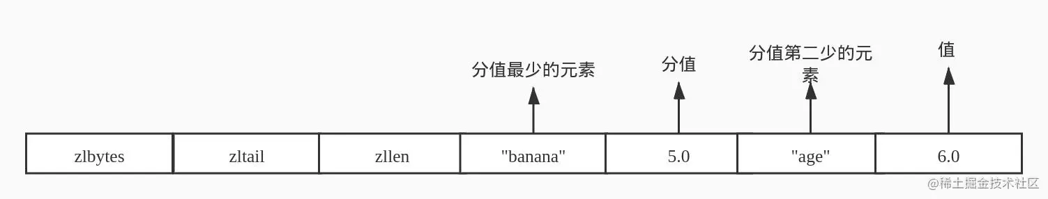 ziplist编码的有序集合对象使用压缩列表作为底层实现,每个集合元素使用两个紧挨在一起的压缩列表节点来保存,第一个节点保存元素的成员,而第二个元素则保存分值