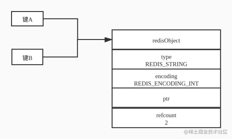 在创建键A与键B 具有相同数值 100 时,此时是让A与B 共享同一个字符串对象。
