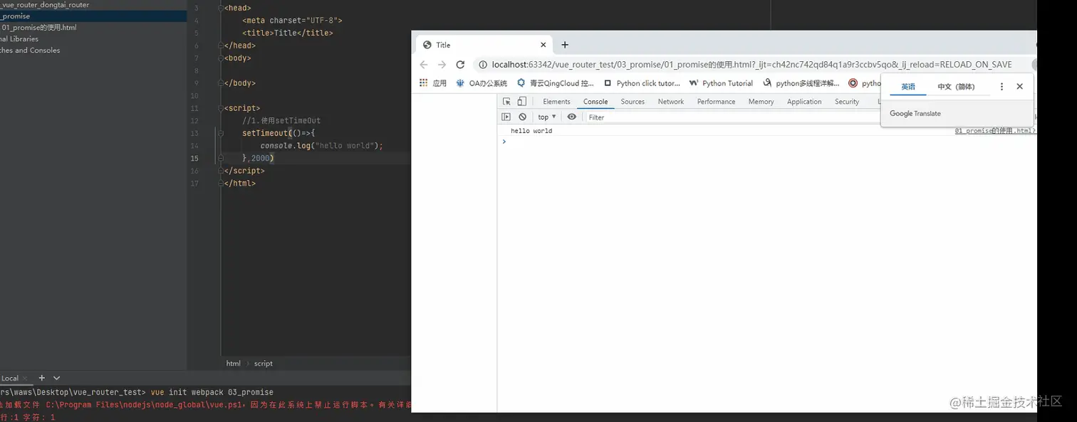 <script> //什么情况下会用到Promise? //一般情况下是有异步操作的时候,使用promise对这个异步操作进行封装 // new --->构造函数(1.保存了一些状态信息,2.执行传入的函数) new Promise((resolve,reject)=>{ setTimeout(()=>{ // 成功的时候调用 // resolve("hello waws") //失败的时候调用 reject("err message") }) }).then((data)=>{ console.log(data); }).catch((data)=>{ console.log(data); }) </script>