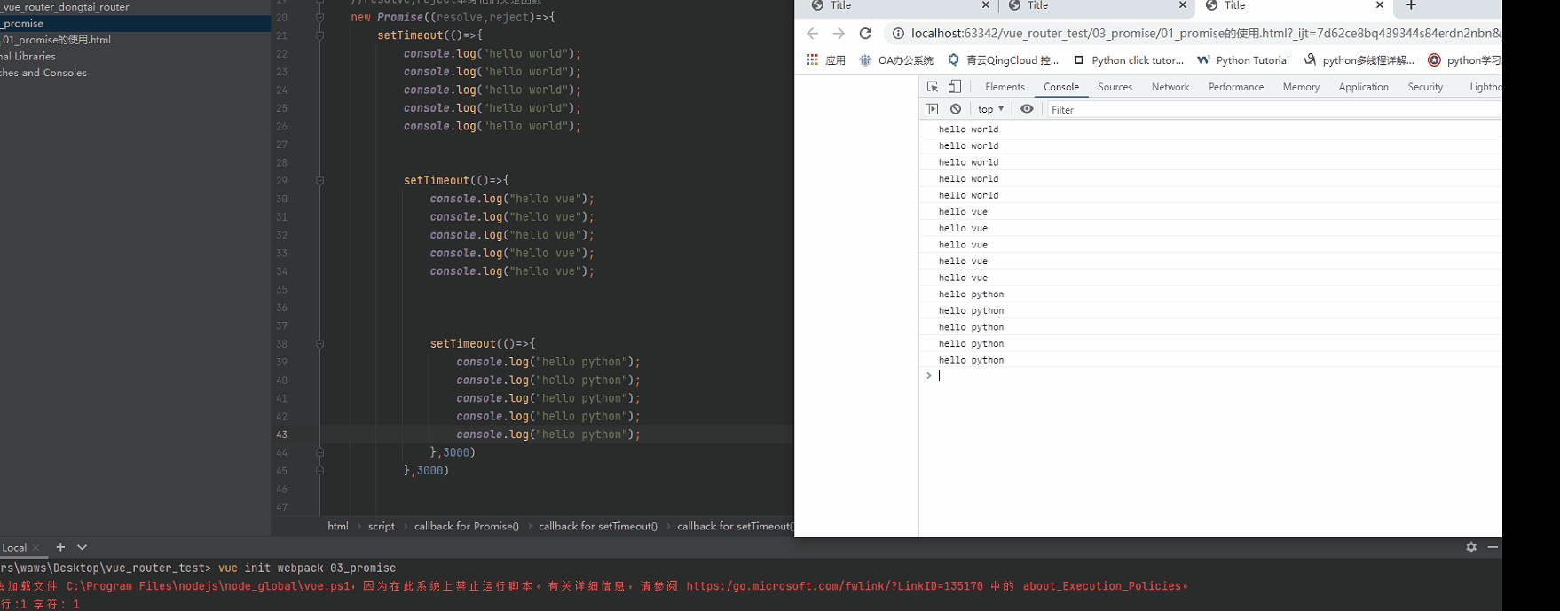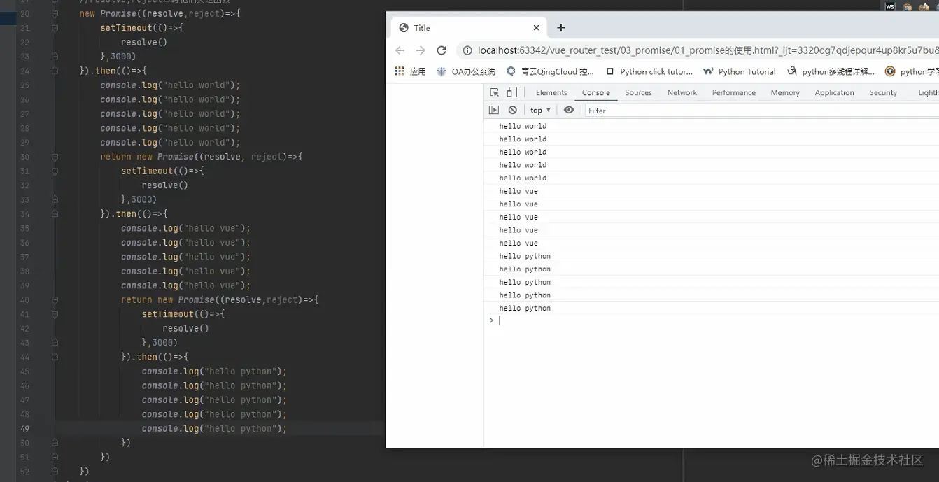 <script> //1.使用setTimeout执行异步操作 // setTimeout(()=>{ // console.log("hello world"); // },3000) //参数-->函数(resolve,reject) //resolve,reject本身他们又是函数 new Promise((resolve,reject)=>{ //第一次网络请求的代码 setTimeout(()=>{ resolve() },3000) }).then(()=>{ //第一次拿到结果的处理的代码 console.log("hello world"); console.log("hello world"); console.log("hello world"); console.log("hello world"); console.log("hello world"); return new Promise((resolve, reject)=>{ //第二次网络请求的代码 setTimeout(()=>{ resolve() },3000) }).then(()=>{ //第二次拿到结果的处理的代码 console.log("hello vue"); console.log("hello vue"); console.log("hello vue"); console.log("hello vue"); console.log("hello vue"); return new Promise((resolve,reject)=>{ //第三次拿到结果的处理的代码 setTimeout(()=>{ resolve() },3000) }).then(()=>{ //第三次拿到结果的处理的代码 console.log("hello python"); console.log("hello python"); console.log("hello python"); console.log("hello python"); console.log("hello python"); }) }) }) </script> -