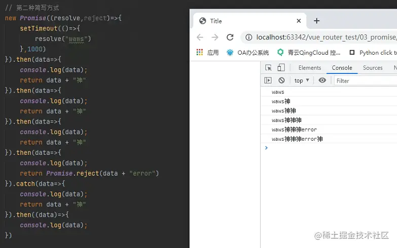 - Promise.reject():将数据包装成Promise对象,并且在内部回调reject()函数