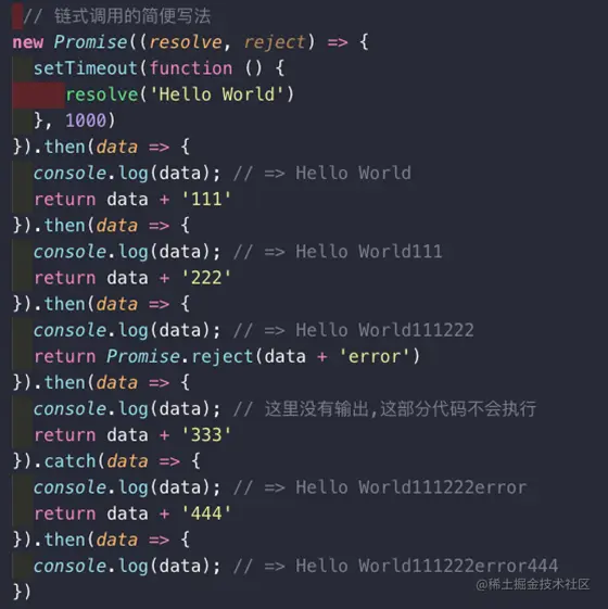 # 我们可以再then函数中传递两个函数,一个表示成功,一个表示失败 new Promise((resolve,reject)=>{ setTimeout(()=>{ resolve("hello waws") //reject("err message") }) }).then(data=>{ console.log(data); },err => { console.log(err); })