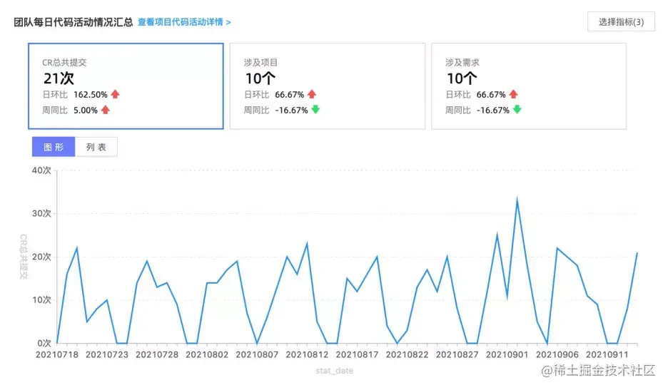 从有数据记录以来,发现从 7 月初到 9 月初,团队的代码活动明显提升,若项目是固定的,CR 频数却上升了,则说明需求量可能有上升趋势,再对比 CR 涉及的项目数趋势,跟 CR 提交趋势线基本吻合,说明有更多的项目利用效能工具的能力,而需求研发可以认为对于项目粒度的研发是表现正常的,但整体趋势是项目增多,也要关注团队同学们的业务压力。