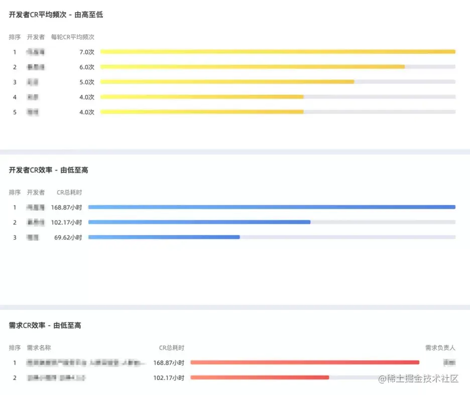 项目下各开发者的 CR 提交频数与负责需求数对比等。