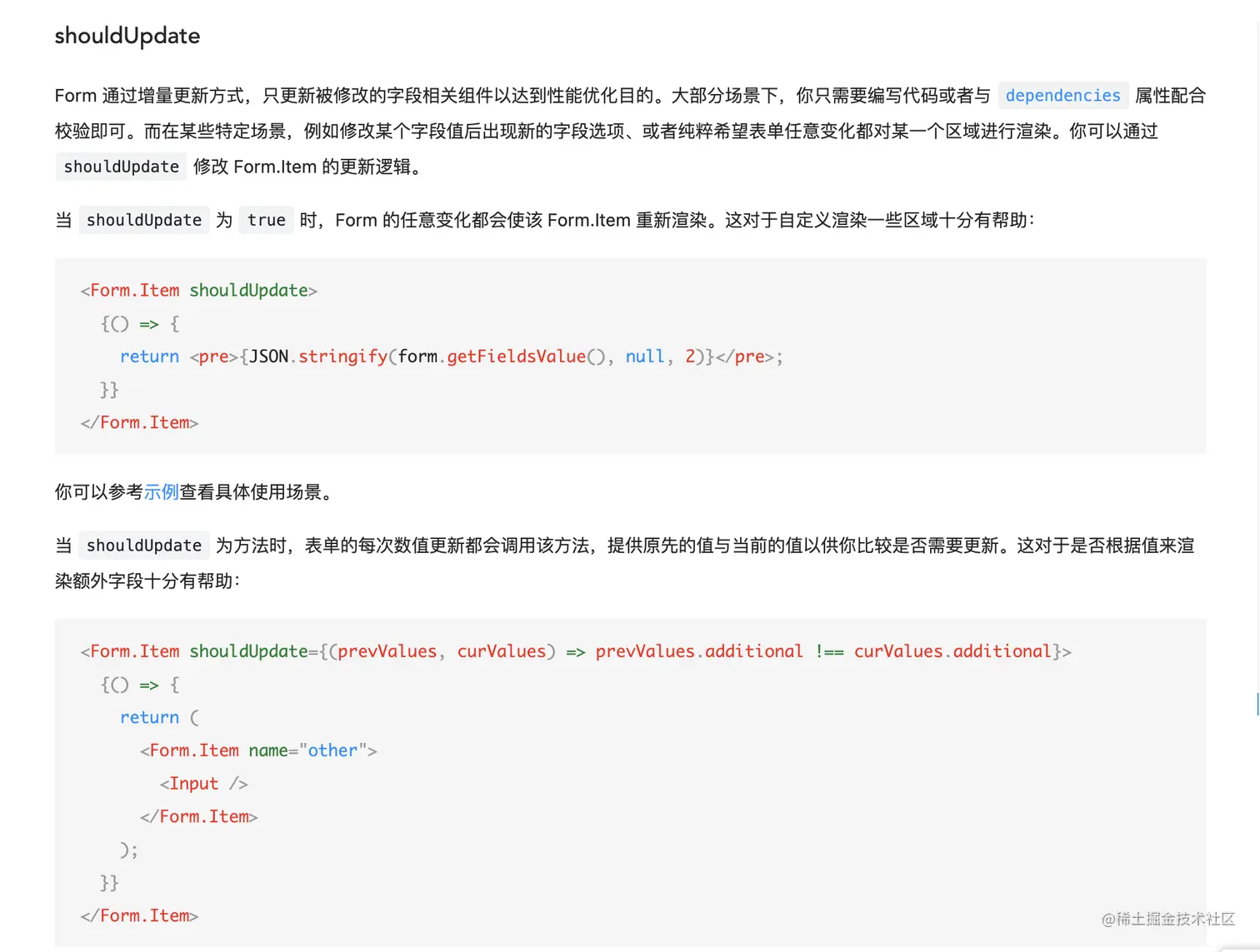 当组件中内部元素需要进行联动去控制状态,例如:通过开关去控制组件内其他元素的显示隐藏;这时候Form无法做到完全接管组件状态,必须通过Switch的onChange事件去控制,导致组件状态过多,代码冗余,组件完整度不够,这时候就可以使用noStyle、shouldUpdate的方式。