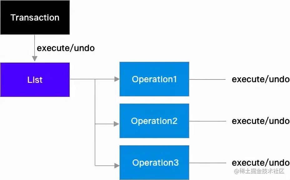 在实际业务开发中,很多场景会涉及到一次性编辑多个组件,即涉及多个Operation实例。于是在Operation基础上有了Transaction——事务的概念,Transaction下维护了一份Operation实例List,每当有execute或者undo执行时,会遍历Operation List中的Operation实例执行其execute或undo方法。