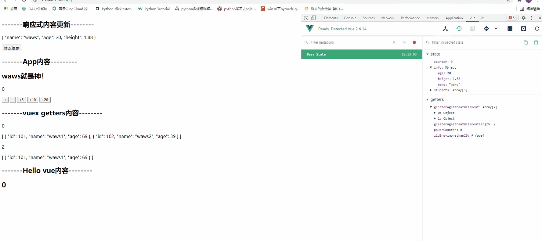 <h2>-------响应式内容更新--------</h2> <p>{{$store.state.info}}</p> <button @click="updateInfo">修改信息</button> # 修改方法 methods:{ updateInfo(){ this.$store.commit("updateInfo") } }