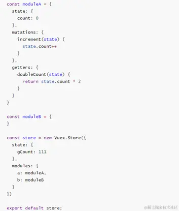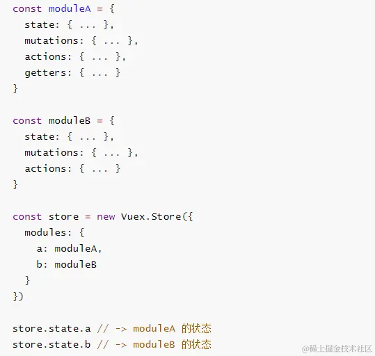 modules:{ a:{ state:{}, mutations:{}, actions:{}, getters:{} }, b:{ state:{}, mutations:{}, actions:{}, getters:{} }, c:{ state:{}, mutations:{}, actions:{}, getters:{} }, }- mutation和getters接收的第一个参数是局部状态对象