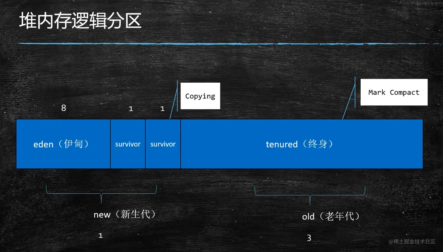 > 年轻代: Eden + s0 + s1,YGC/YOUNG GC/Minor GC > YGC回收之后大多数对象会被回收,活着进入Survivor区
