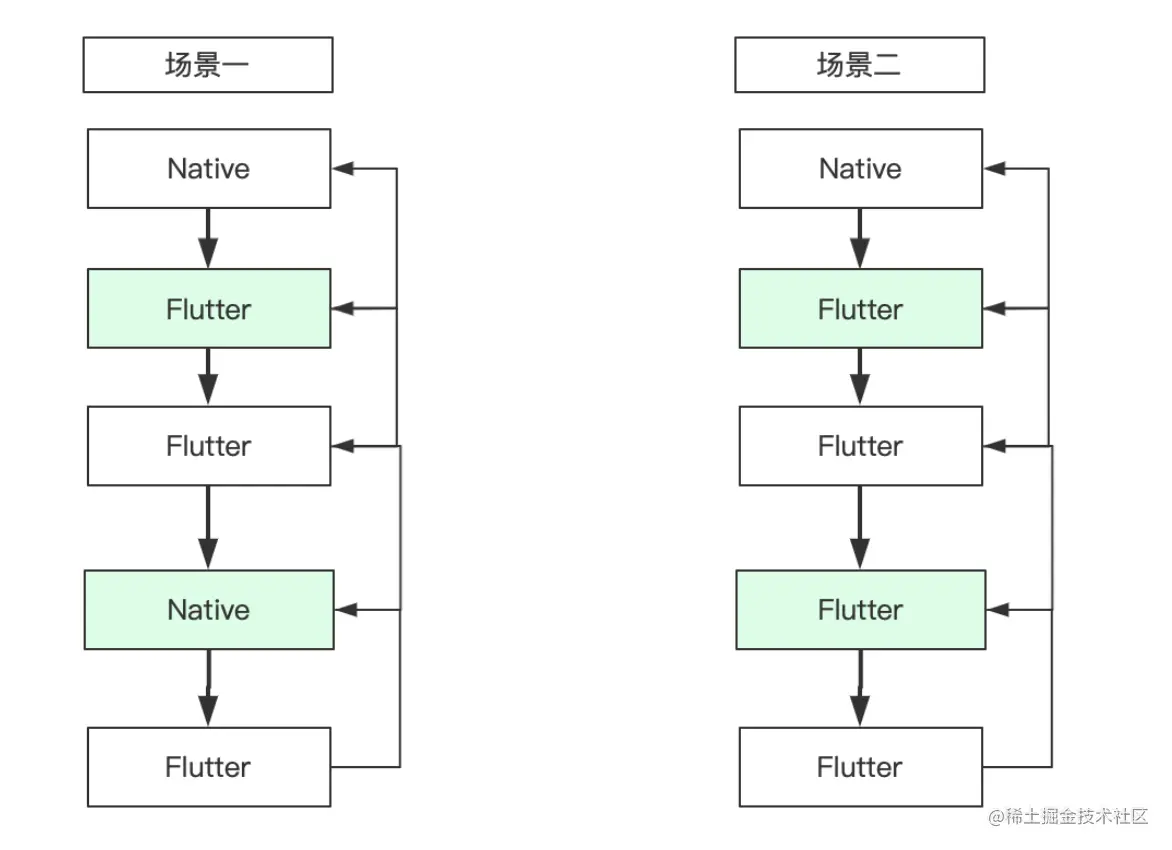 这边有两种常见场景:(如果使用场景一使用flutter原生方式,可能会涉及开多个引擎的问题,就会导致内存开销很大的问题。场景二就需要开启一个引擎即可)场景一使用flutter_boost可解决多引擎问题。有兴趣可参考demo体验:github.com/yj229201093… (两个分支:master 是flutter_boost方式, flutter_native分支是flutter原生方式)