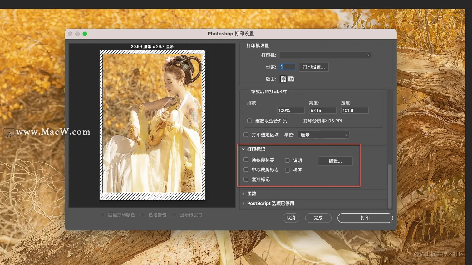 如果我们需要进行打印标记的设置,可以在打印标记中选择需要打印的标志