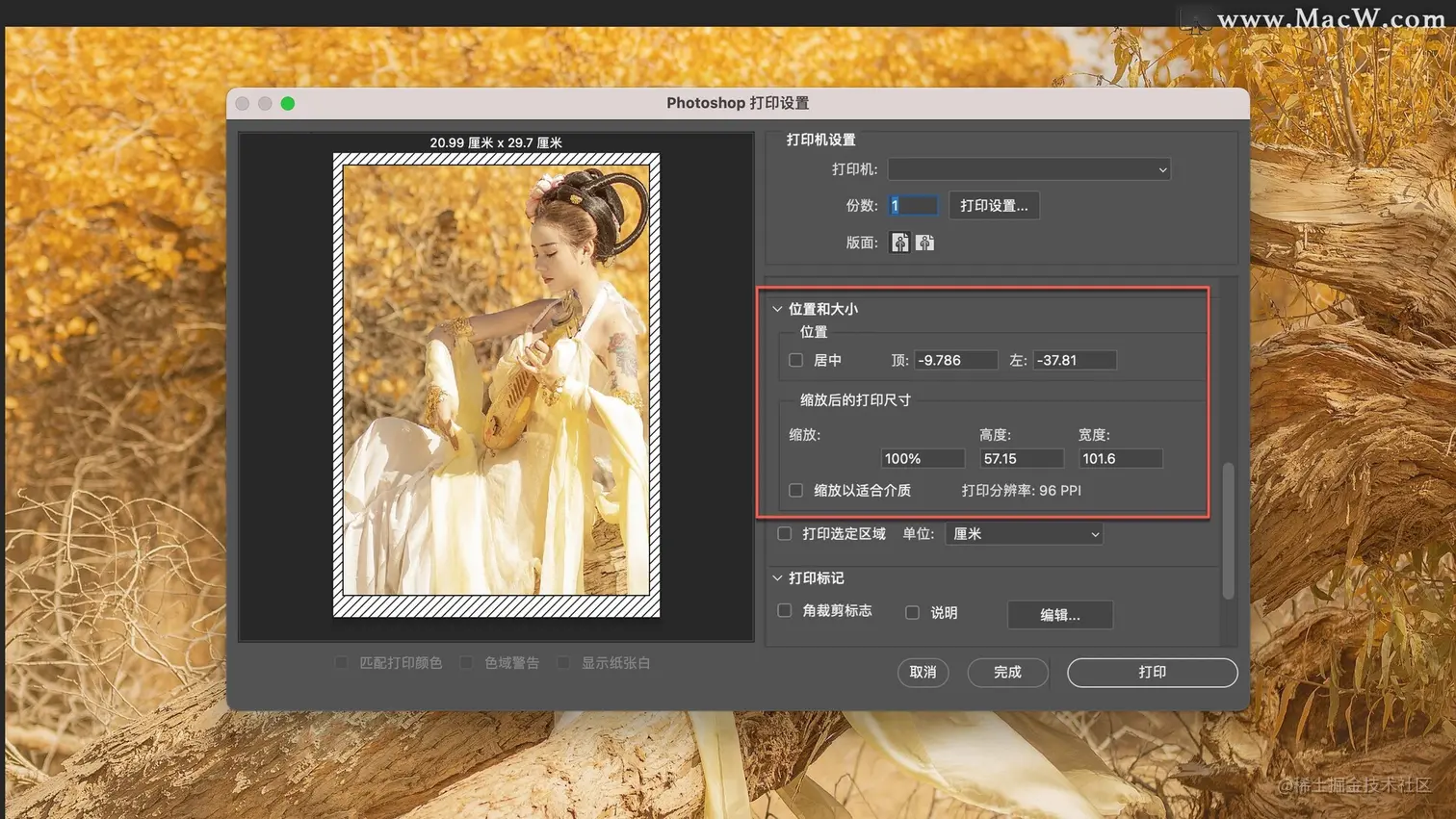 位置和大小中,一般默认是居中显示,如果居中不能完成显示,可以选择缩放以适合介质