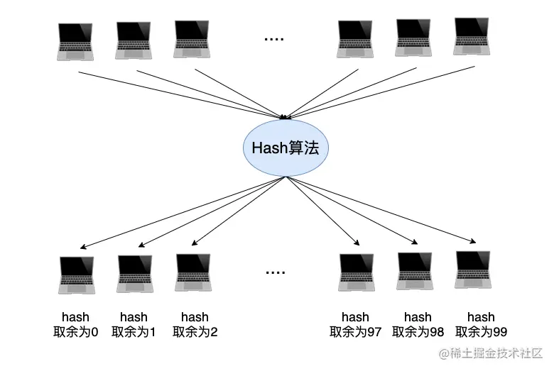 上面所说,一台机器的内存肯定不能把所有的 ip 全部加载进去,必须在不同机器上先 hash 区分,先看每台机器上,50G 文件,假设我们分成 100 个小文件,那么平均每个就500M,使用 Hash 函数将所有的 ip 分流到不同的文件中。