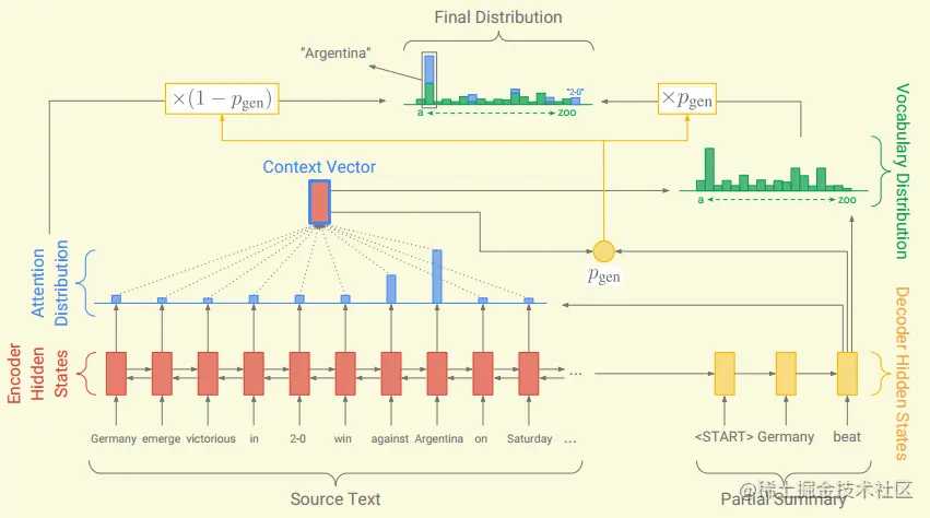 重复是seq2seq模型经常出现的问题,本文引入 Coverage model来解决这个问题,这也是本文的主要亮点。具体实现上,就是将之前所有step的注意力权重相加到一个覆盖向量(coverage vector) 上。就是用先前的注意力权重决策来影响当前注意力权重的决策,这样就避免在同一位置重复,从而避免重复生成文本。具体计算如下: 然后将覆盖向量添加到注意力权重的计算过程中: 这就可以使得在计算注意力权重时,当前的决定是受到历史决定影响的,这样就可以让注意力机制避免重复关注某个位置,也就可以避免生成重复词语。
