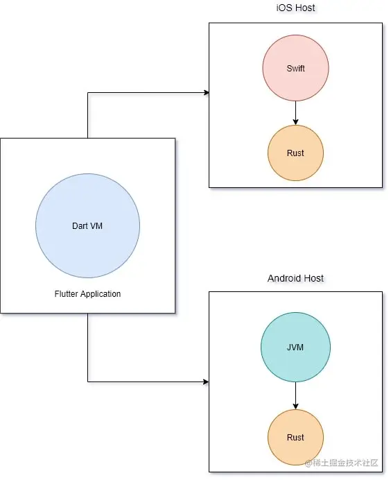Flutter Platform channels是一个灵活的系统,它允许你调用平台特定的API,无论是在Android上的Kotlin或Java代码中,还是在iOS上的Swift或Objective-C代码中都可以使用。 这样一来,我们将不得不首先把我们的Rust代码与Java(用于Android)、Swift(用于iOS)和WASM(用于Web)绑定,但这将是一个过于复杂的过程,也许这可能会导致未来的性能问题。下面是一个简单的图表,让我们了解一下它是怎样的。