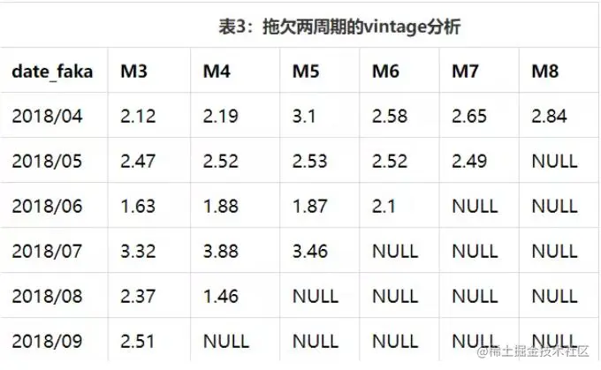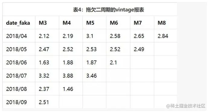 通过vintage报表,可以看出,不同月份的发卡账户的同一mob下的拖欠率的变化情况。