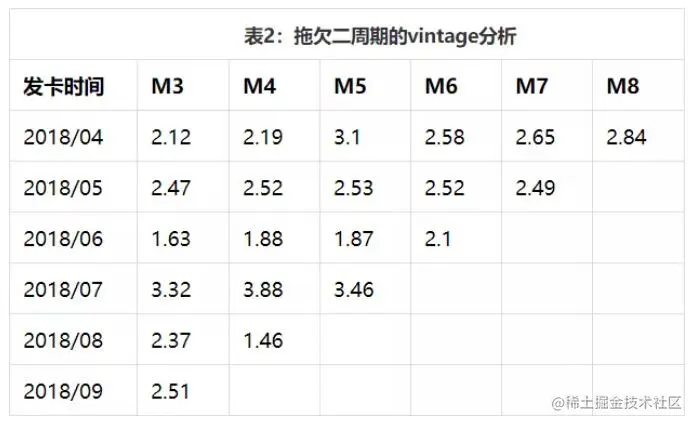 第一行数据意思是:数据2.12%为2018年4月所发信用卡在2018年7月时拖欠二周期的金额除以该批信用卡在2018年7月时透支余额,依此类推,得到全表的数据。在此基础上,按照账龄为经营时间减去发卡时间进行表间数据的转换,得到MOB,得到表2: