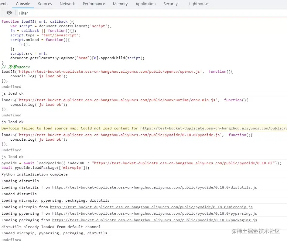 为了方便观察运行过程,使用动态的方式加载所需js和执行python代码。打开浏览器控制台,依次运行以下语句: