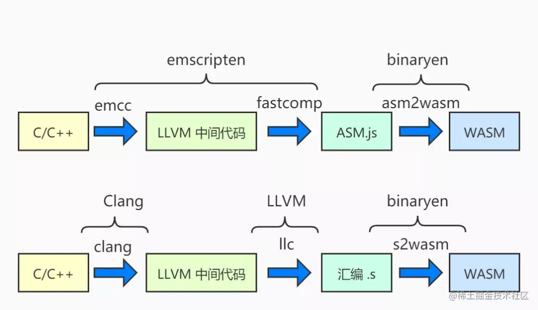 下图展示了业内常用的两种编译为wasm的方式。