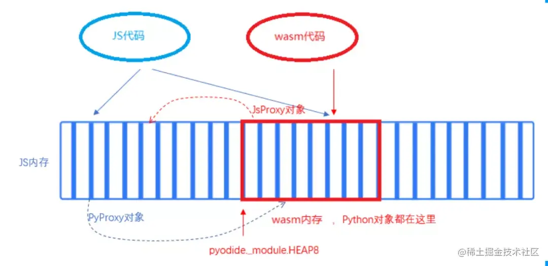 作为一个wasm格式的普通程序,pyodide被调用起来后,当然只能直接访问wasm内存。