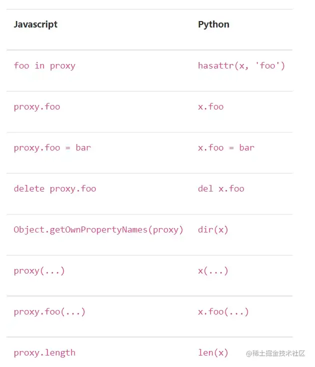 - 【手动转换】各种class、function和用户自定义类型,因为对方的语言没有对应的现成类型,所以只能以proxy的形式存在,需要通过运算符来间接操纵,就像操纵提线木偶一样。为了达到方便操纵的目的,pyodide对两种语言进行了语法模拟,用一种语言里的操作符模拟另一种语言的类似行为。例如:JS中的let a=new XXX(),在Python中就变为a=XXX.new()。