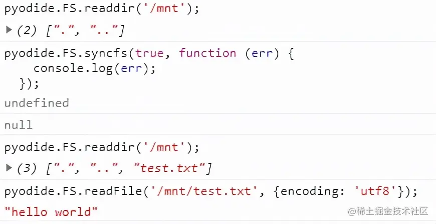 pyodide.FS.writeFile('/mnt/test.txt', 'hello world');