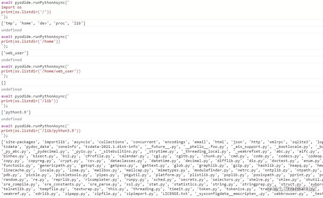 注意,这个文件系统是内存里虚拟出来的,刷新页面就丢失了。不过由于浏览器本身有缓存,所以刷新页面后从服务端再次加载pyodide的引导js和主体wasm还是比较快的,只要不清理浏览器缓存。