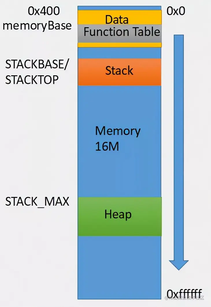 Data数据段是从0x400开始的, Function Table表也在其中,起始地址为memoryBase(Emscripten中默认为1024,即0x400),STACKTOP为栈地址起始,堆地址起始为STACK_MAX。而我们实际更关心的是Javascript内存与wasm内存的互相访问。
