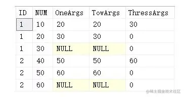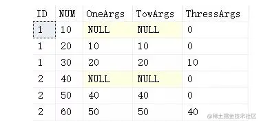 1、针对列OneArgs,组内的NUM列的值默认向后偏移了一行,每组的第一行用默认的NULL来代替