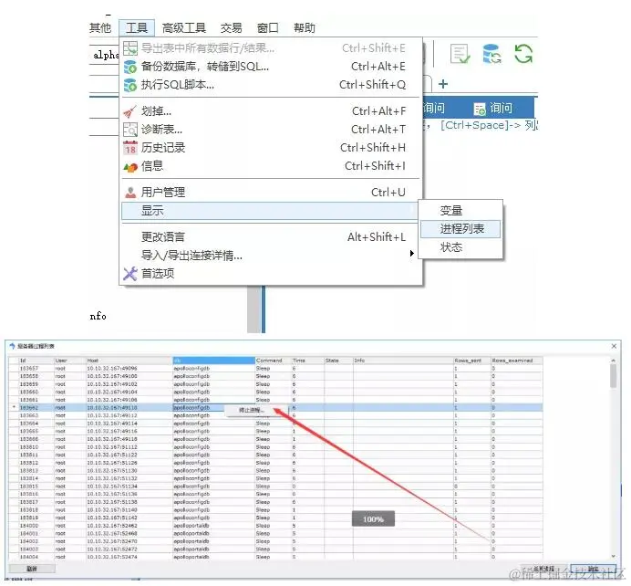如果你使用的sqlyog,那么也有图形化的页面,在菜单栏-工具-显示-进程列表。在进程列表页面可以右键杀死进程。如下所示: